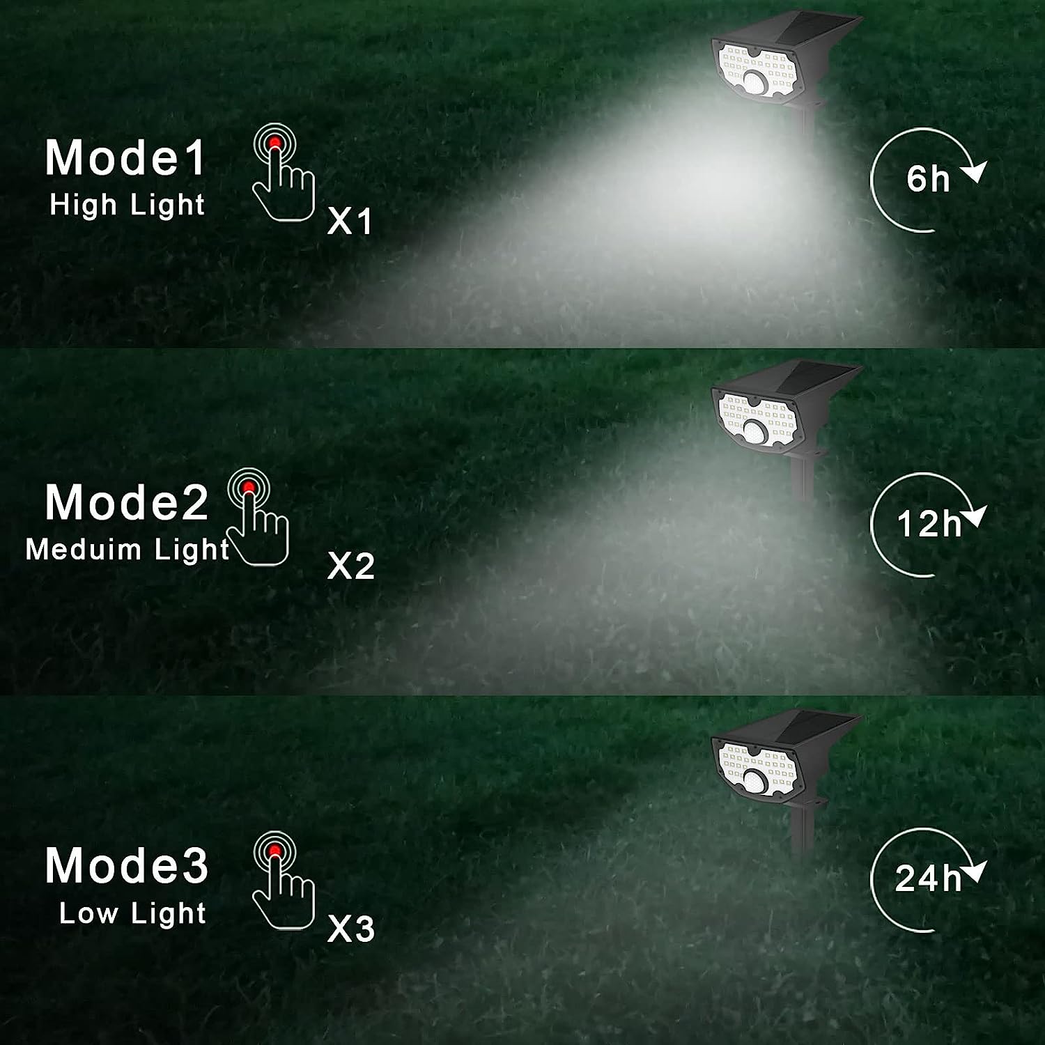 【3 modes d'éclairage】les lampes de jardin disposent de 3 modes d'éclairage de luminosité au choix, Le mode 1 détecte une luminosité élevée, ne détecte pas la lumière faible, le mode 2 luminosité moyenne est toujours activé, le mode 3 détecte une luminosité élevée, ne détecte pas la lumière éteinte.Le capteur de mouvement avec sa précision et sa sensibilité élevées offre un angle de détection de 120 degrés et une plage d'induction de 8 m.