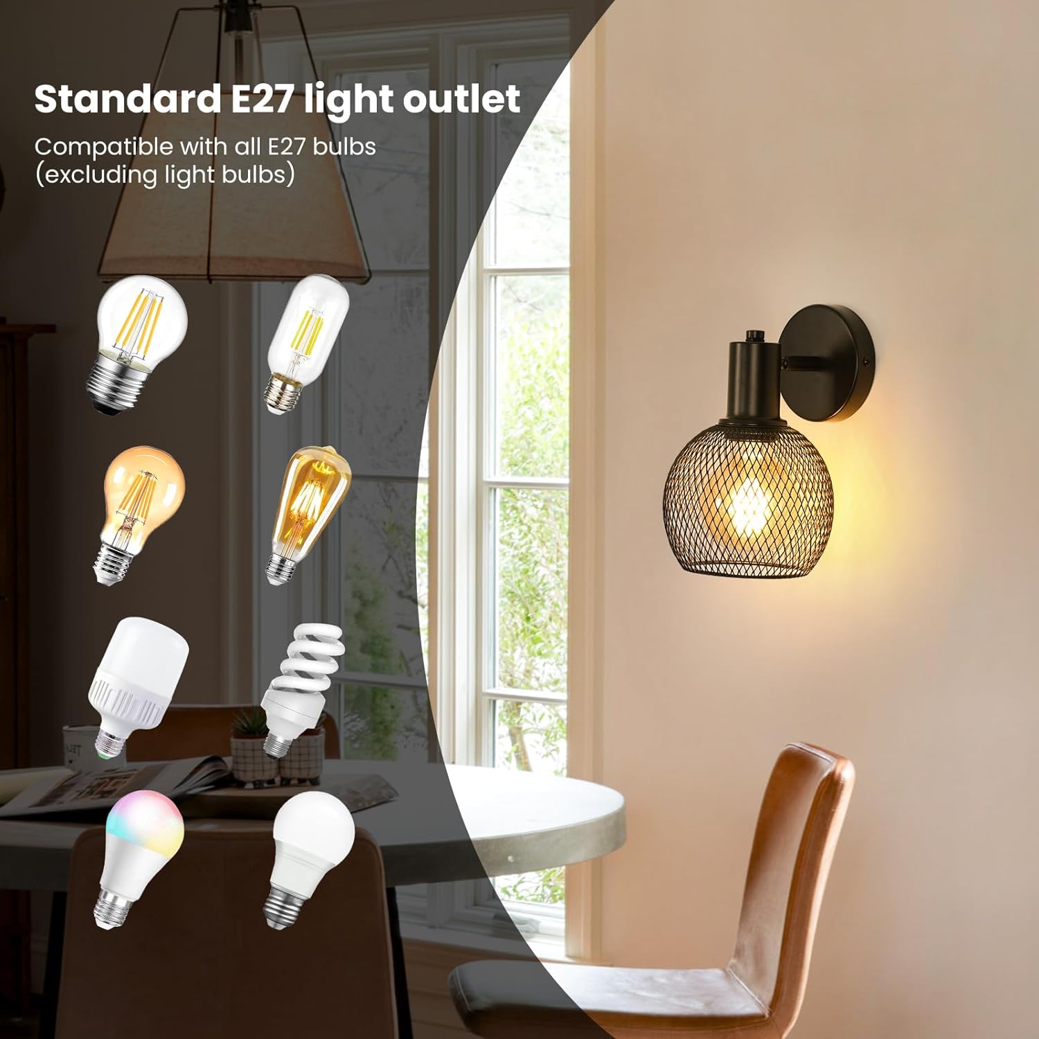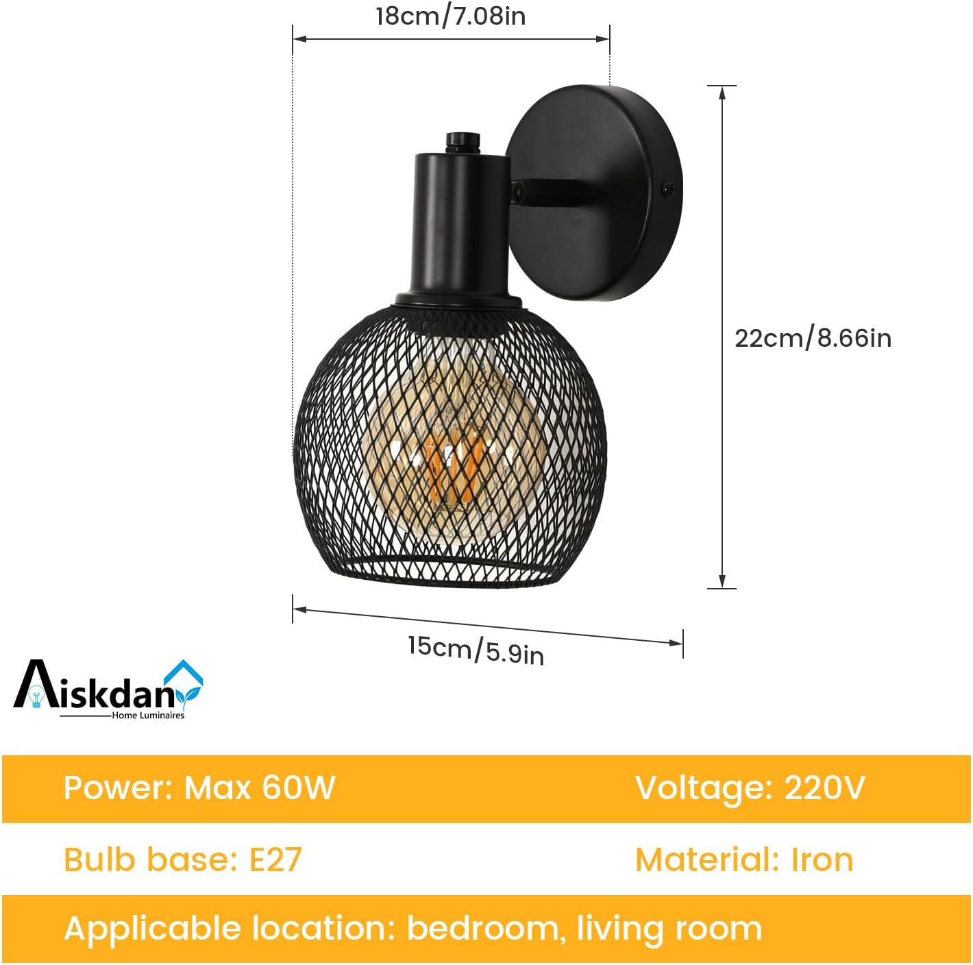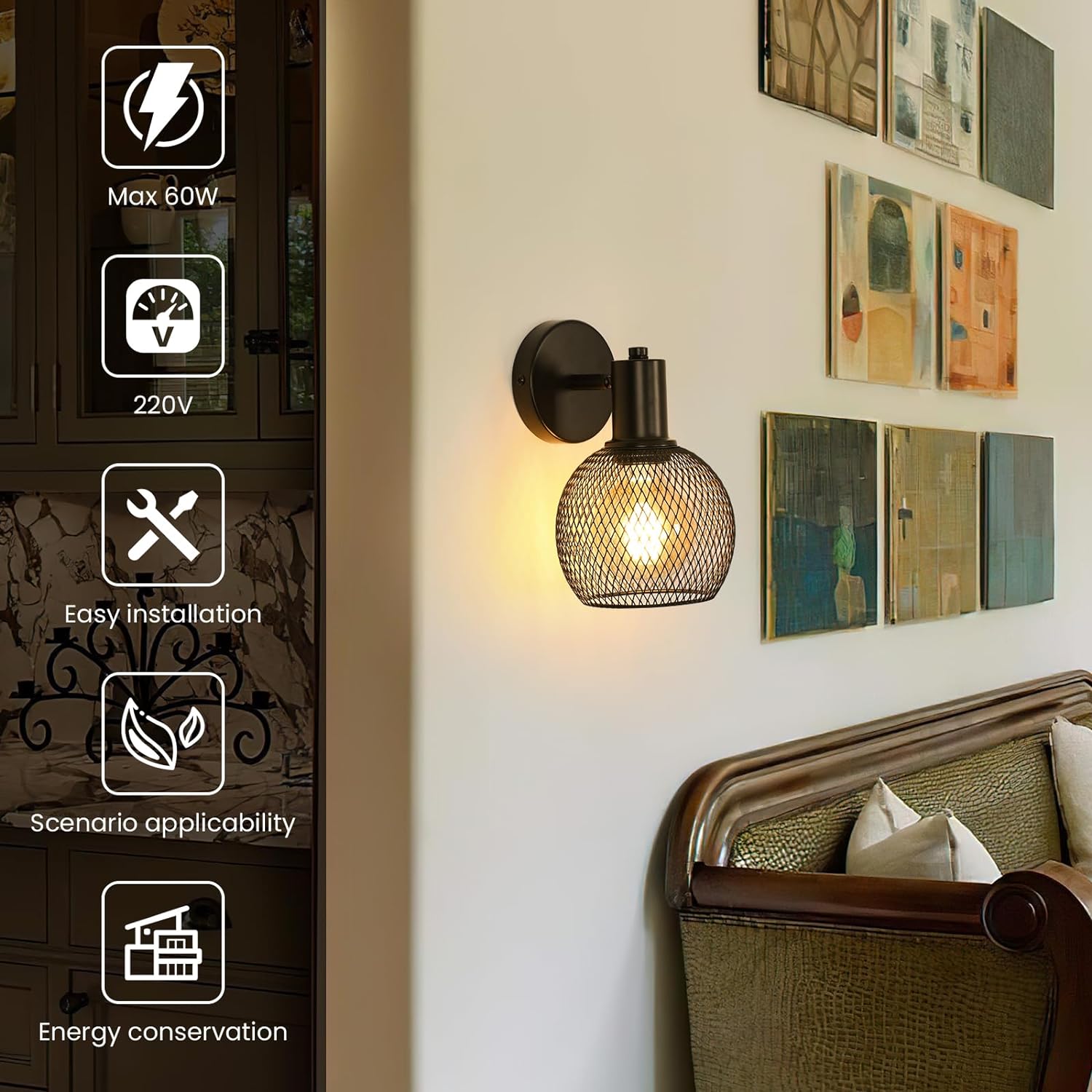 Taille : la taille de cette liseuse vintage en métal noir est de 18*15*22CM, poids 350g.Matériau de qualité : Fabriquée en fer noir de haute qualité avec des grilles, cette applique murale donne une impression de mystère.Design unique : Conception en forme de cage, style de conception unique, sous la lumière, l'ombre en forme de grille sera dispersée autour, la conception du châssis épais ne vous inquiétera plus de sa stabilité.Facile à remplacer : Cette applique murale squelette convient à toutes les ampoules E27 jusqu'à 60W, 220V, y compris les ampoules incandescentes, CFL, LED, Edison, etc., avec une longue durée de vie (ampoule non incluse)Lieux d'application : En tant qu'applique décorative d'intérieur, elle peut être facilement décorée dans différentes scènes, telles que la chambre à coucher, le salon, la table de chevet, le couloir, le café et d'autres endroits. Le design industriel rétro ajoute de la beauté à votre espace décoré.