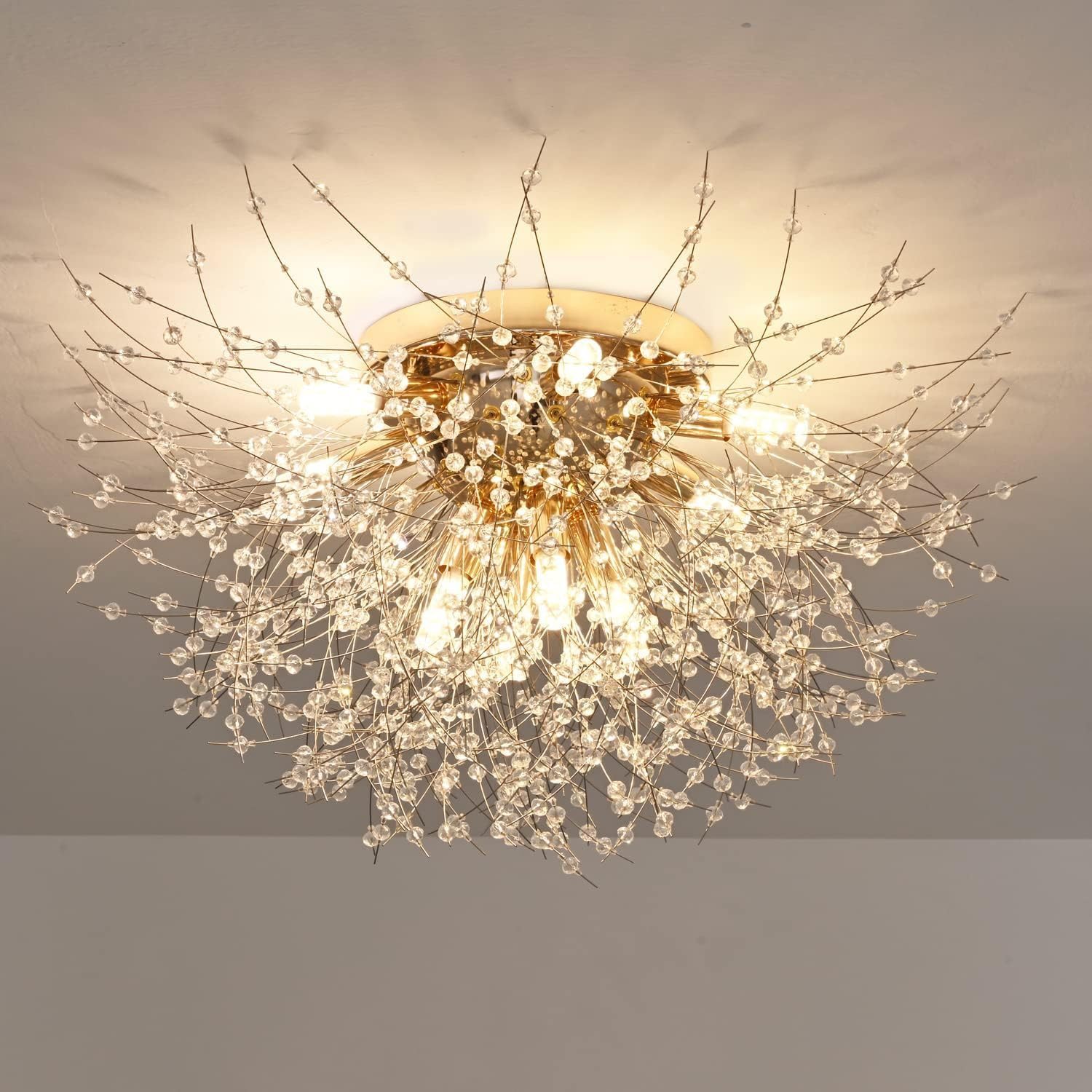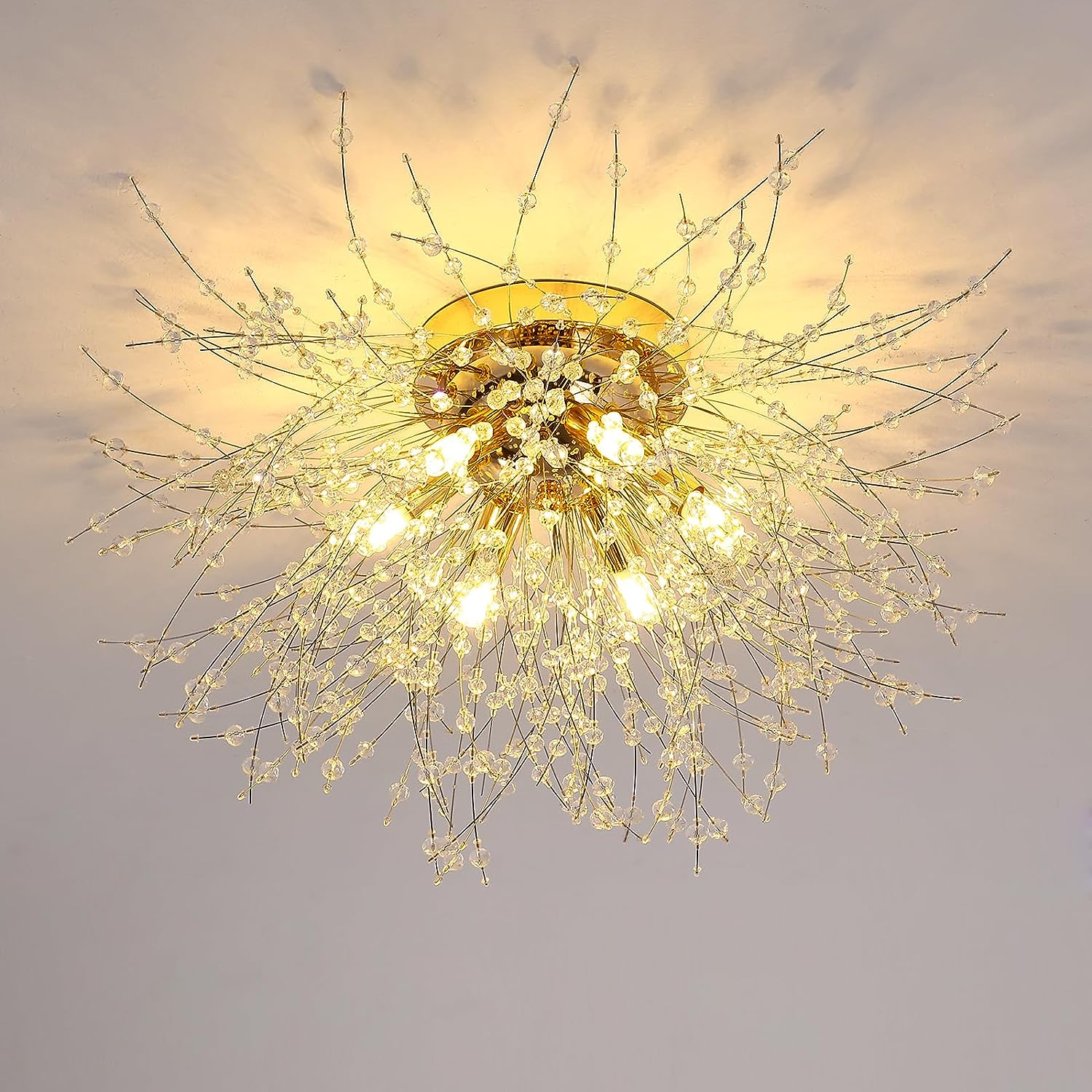 Le plafonnier brille dans la lumière réfractée et, de loin, ressemble à un brillant feu d'artifice.