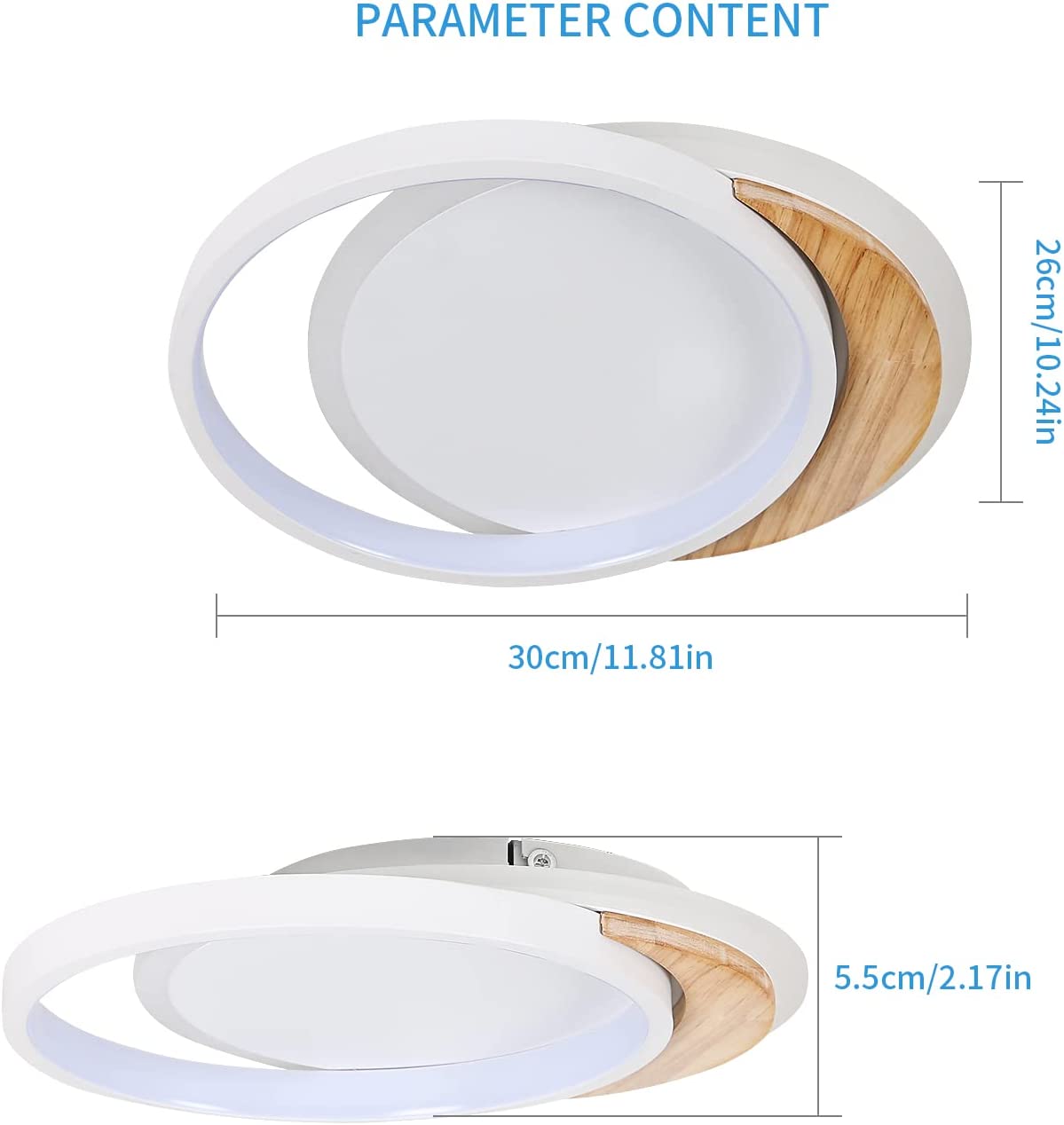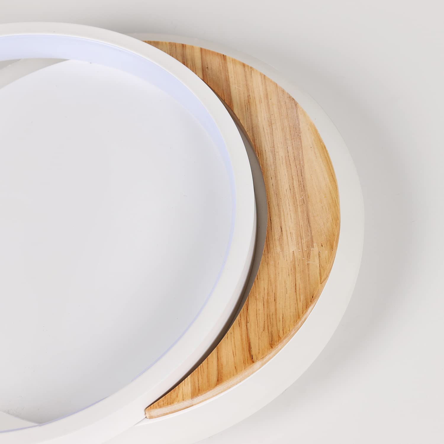 Double ring Design: le plafonnier LED Moderne adopte le design à double anneau, qui a une apparence unique et élégante. Le corps de la lampe est fait de matériau métallique, robuste et durable. Le bord intérieur est décoré de chêne, le grain de bois est transparent, sain et insipide, et la texture est unique et durable.