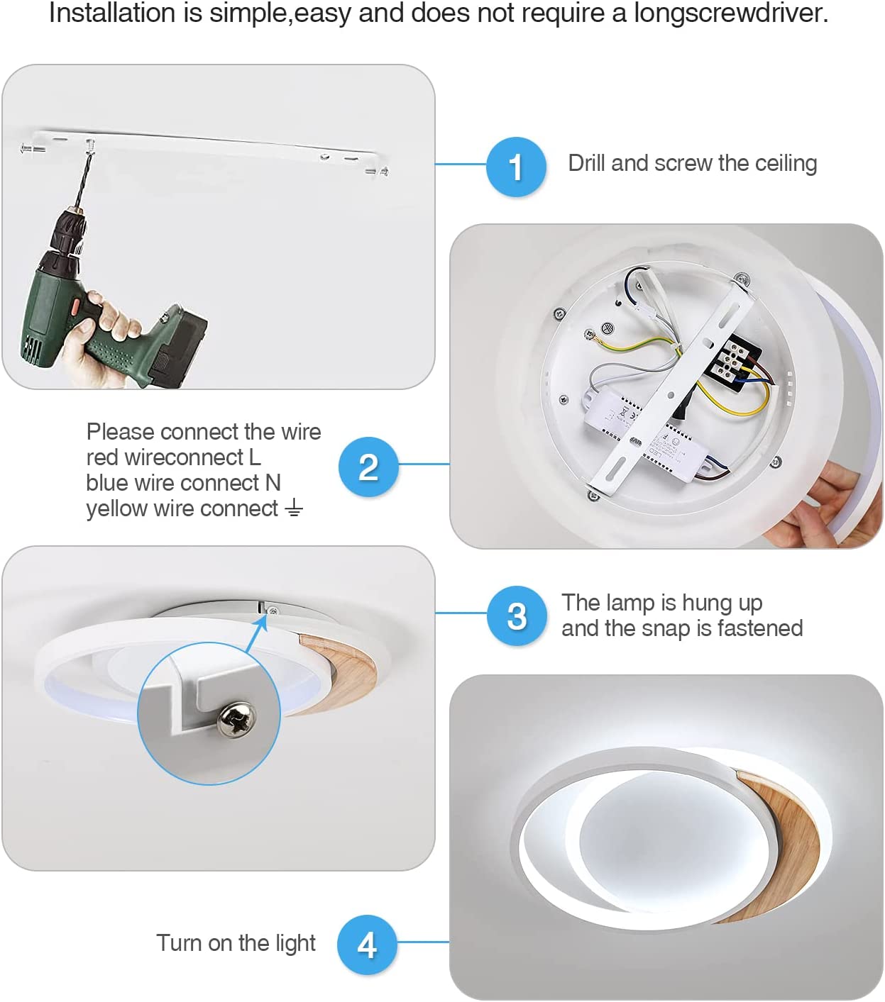 Installation facile: comprend des instructions d'installation et tout le matériel de montage pour une installation rapide et facile. Lors de l'installation, veuillez d'abord désactiver l'alimentation, fixer la base du plafond moderne au plafond avec des vis, puis connecter les fils.
