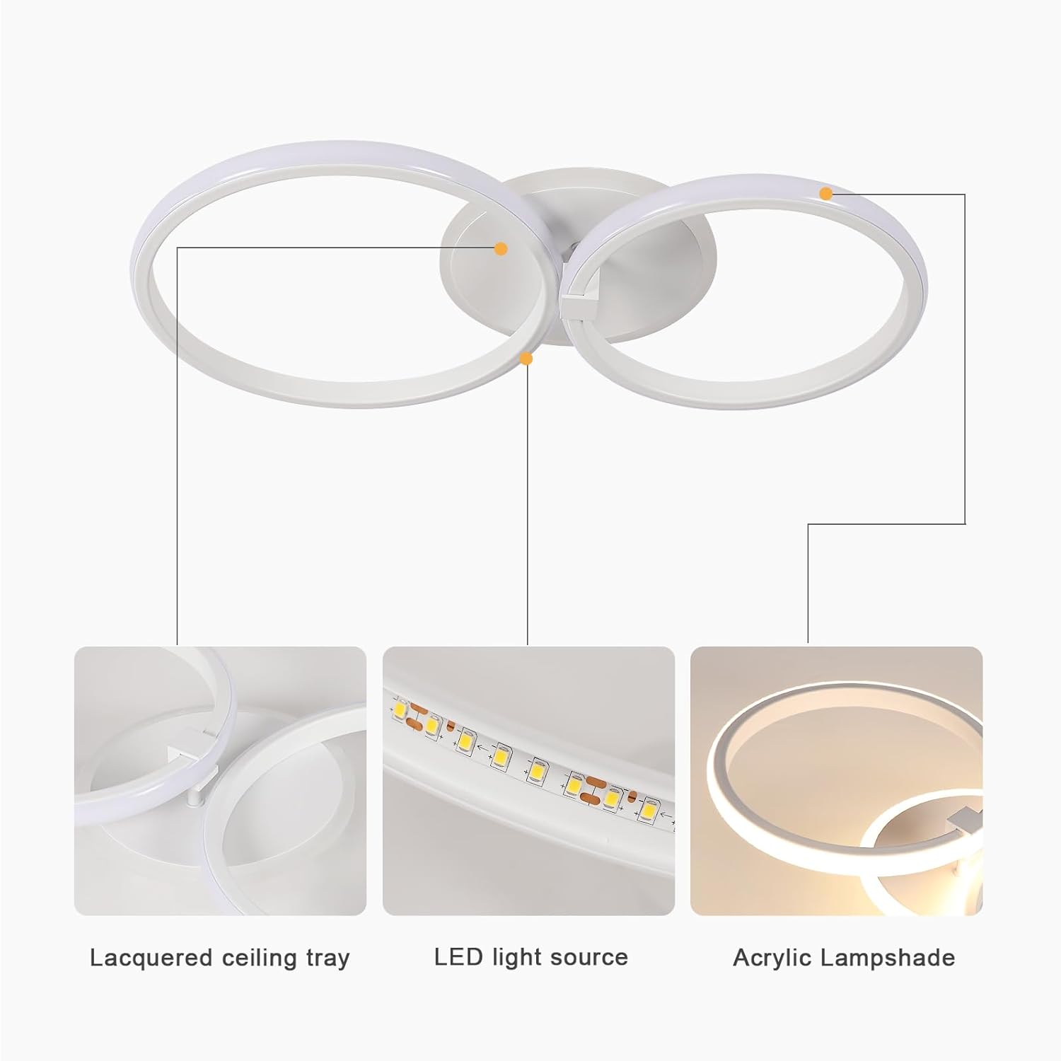 A double-ringed circular shape in white complements minimalist or contemporary decor. Adds a decorative element even when turned off.