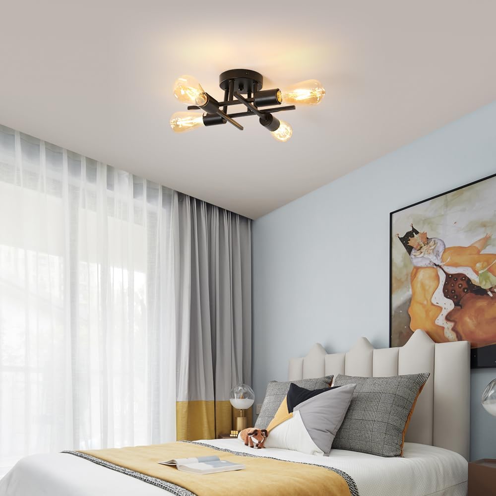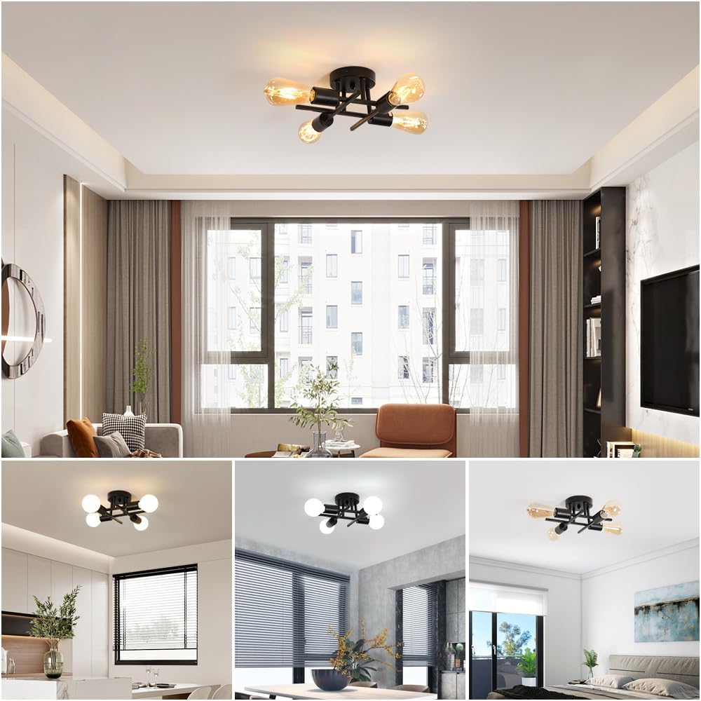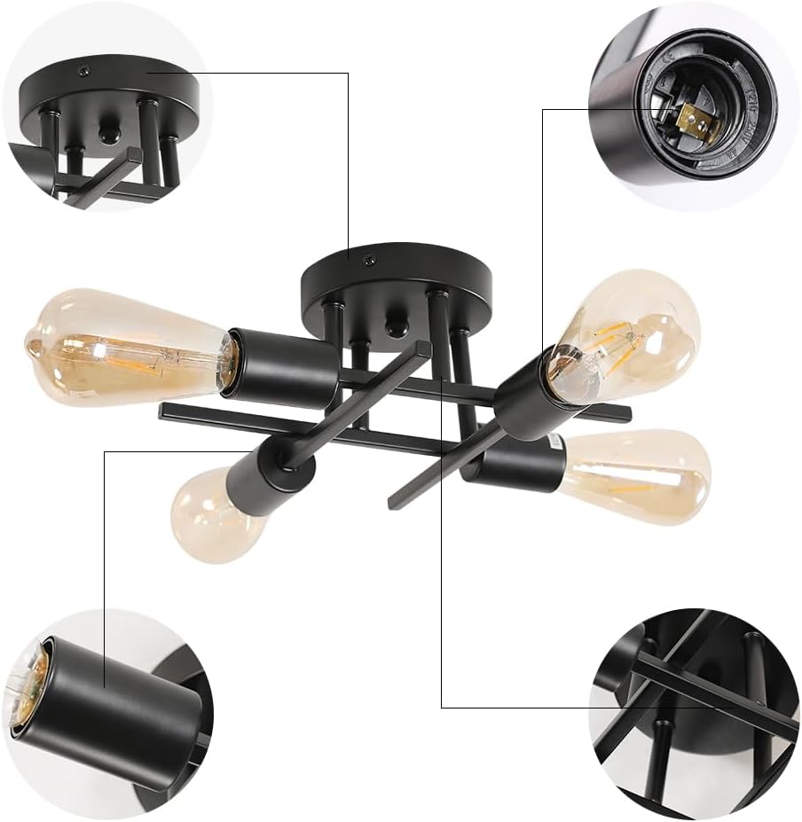 E27 Plafonnier Industriel Noir, 4 Lumières Moderne Plafonnier Lustre Luminaire Industriel en Metal